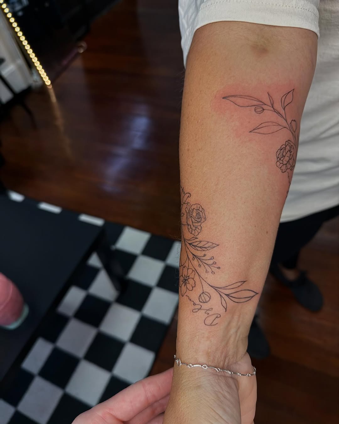 Name in Tiny Fine Line on Arm – Minimal chic style.