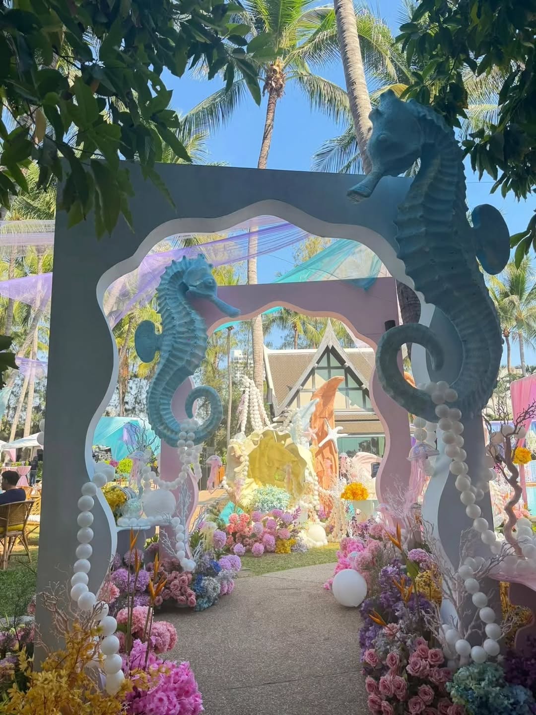 Tropical Paradise Setup – Palm leaves and bright flowers.