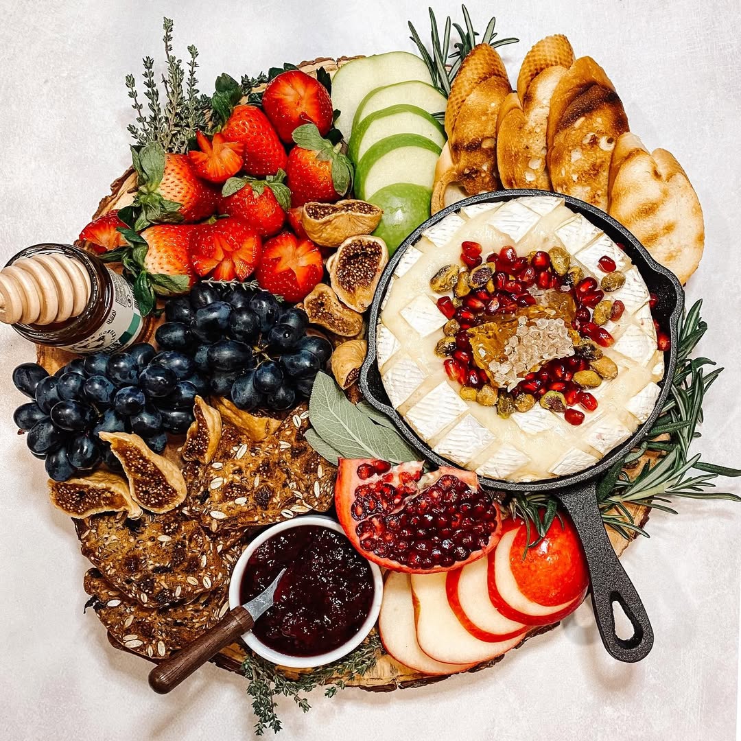 Brie & Fruit Board – Brie, strawberries, figs, and honey drizzle.