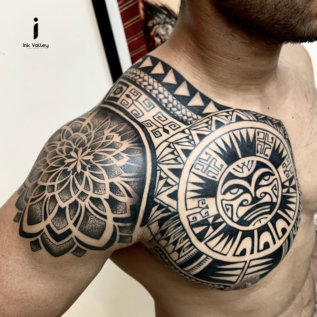 Tribal Sleeve Extending to Chest – Bold and masculine.