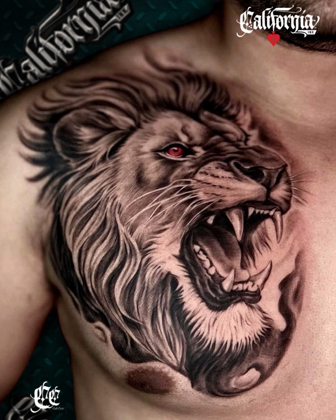 Lion Chest Tattoo – Symbolizes courage, strength, and leadership.