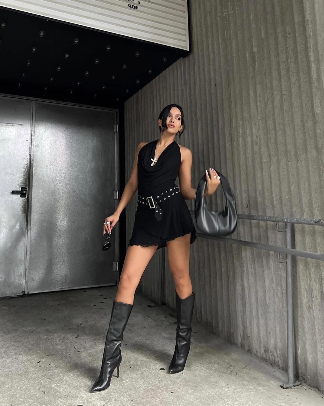 Studded Jacket + Black Dress – Feminine edge for concerts.