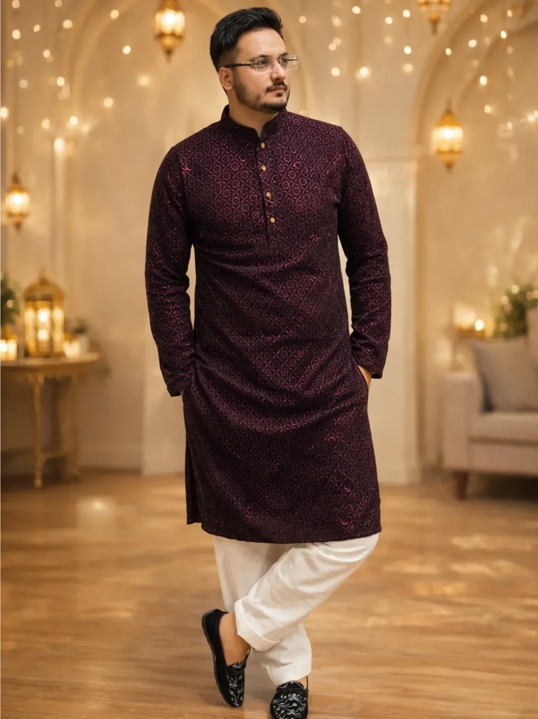 Embroidered Kurta + Festive Shoes – Attention to detail for a polished look.