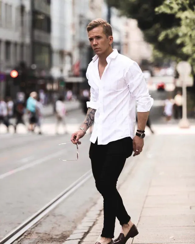 Classic White Shirt with Black Trousers – Timeless, Italian dinner party staple.