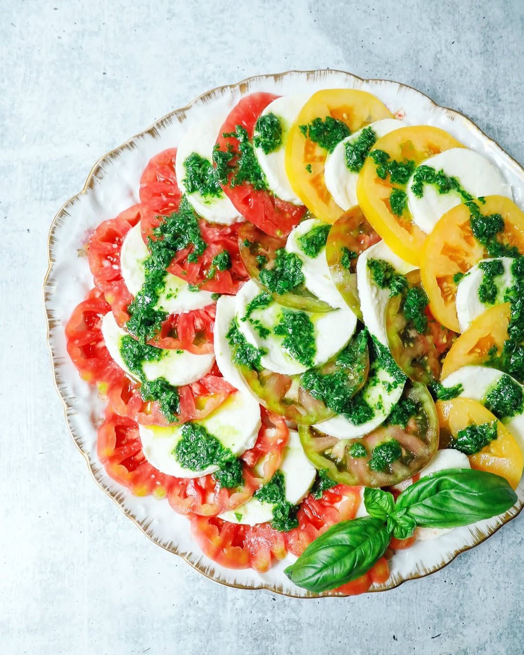 Mozzarella & Tomato Salad – Simple layers of mozzarella, tomatoes, olive oil, and herbs.