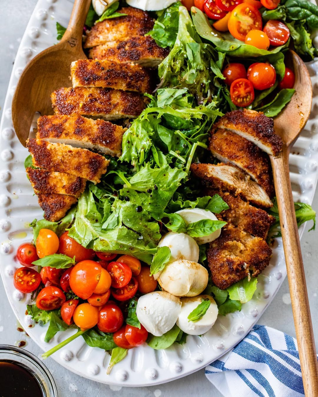 Chicken Caprese Salad – Grilled chicken with mozzarella, tomatoes, and basil.