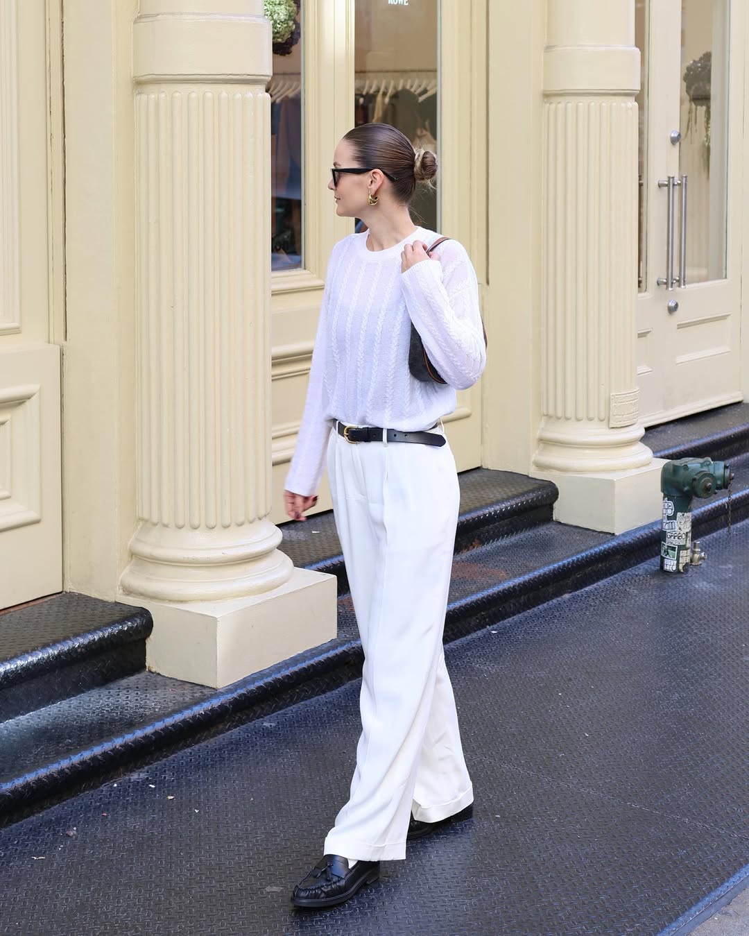 Monochrome Knit Top + Wide-Leg Trousers + Loafers – Modern minimalist office look.