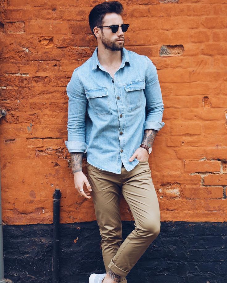 Denim Shirt + Khaki Pants + Loafers – Casual weekend elegance.