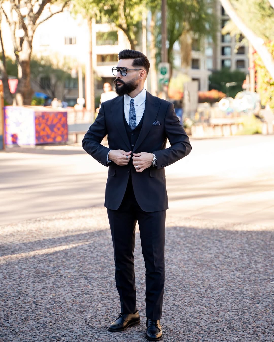 Tailored Suit + Crisp Shirt + Minimal Jewelry – Classic executive style.