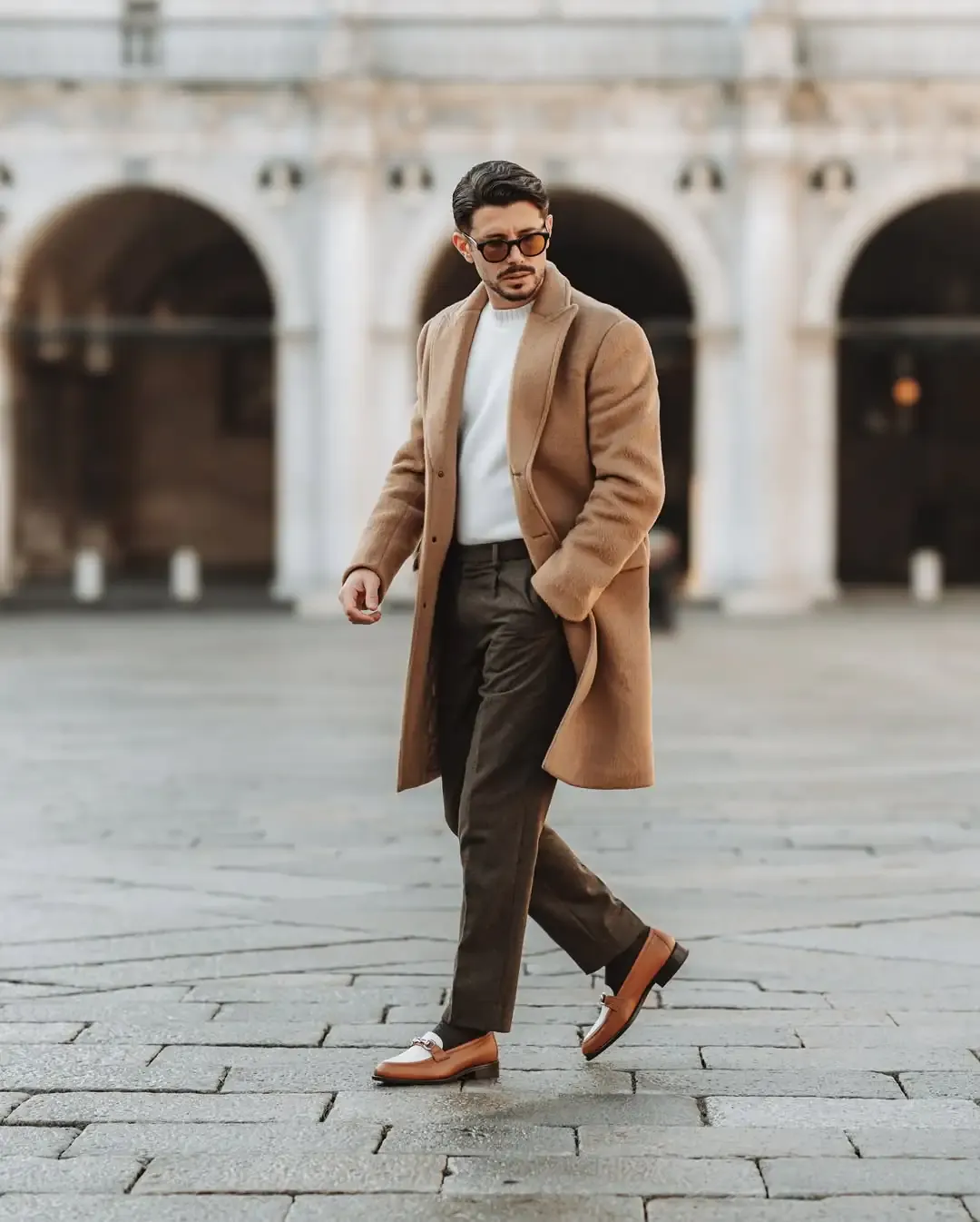 Camel Coat + Black Trousers + Loafers – Iconic Old Money winter look.