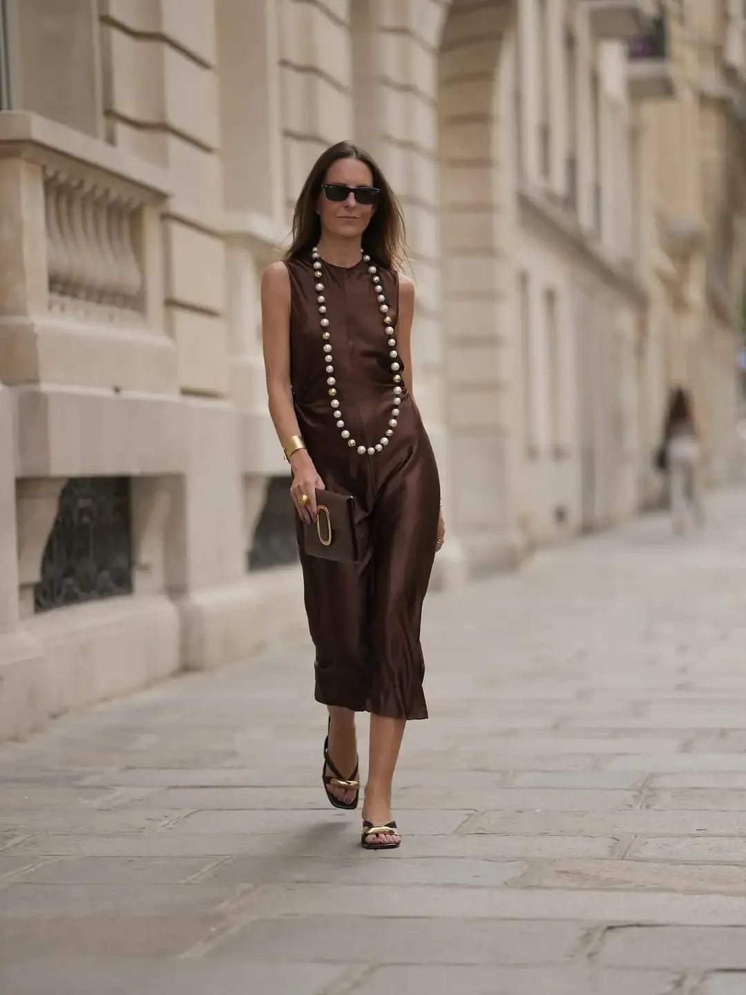 Silk Midi Dress + Pearl Necklace + Heels – Classic formal elegance.