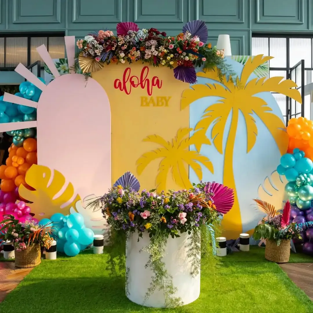 Tropical Luau Baby Shower – Think palm leaves, leis, hibiscus flowers, fruity drinks, and vibrant colors. Perfect for poolside or backyard parties.